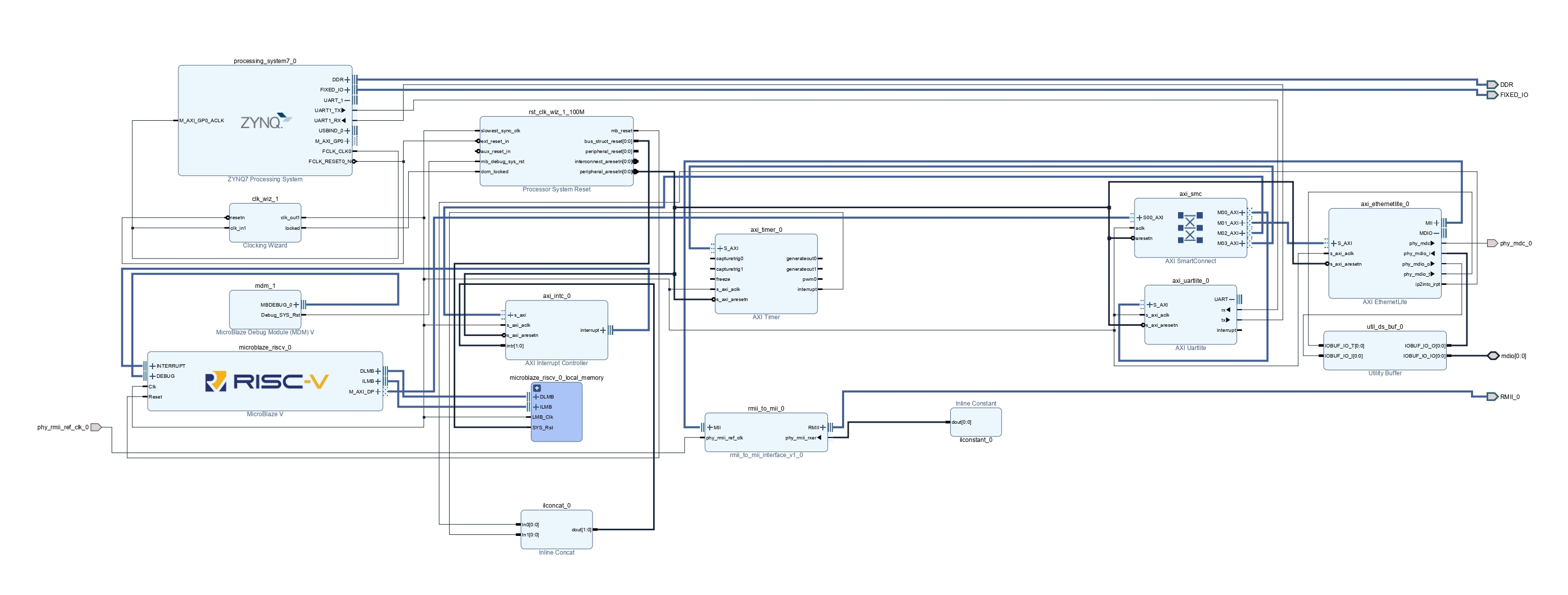 Peripheral interrupt signals are combined using an AXI Interrupt Controller, which collects interrupt requests from devices such as the Ethernet MAC, timer, and UART. These signals are aggregated and delivered to the MicroBlaze processor as a single interrupt input, allowing the software to respond to events such as received Ethernet packets or timer expirations.